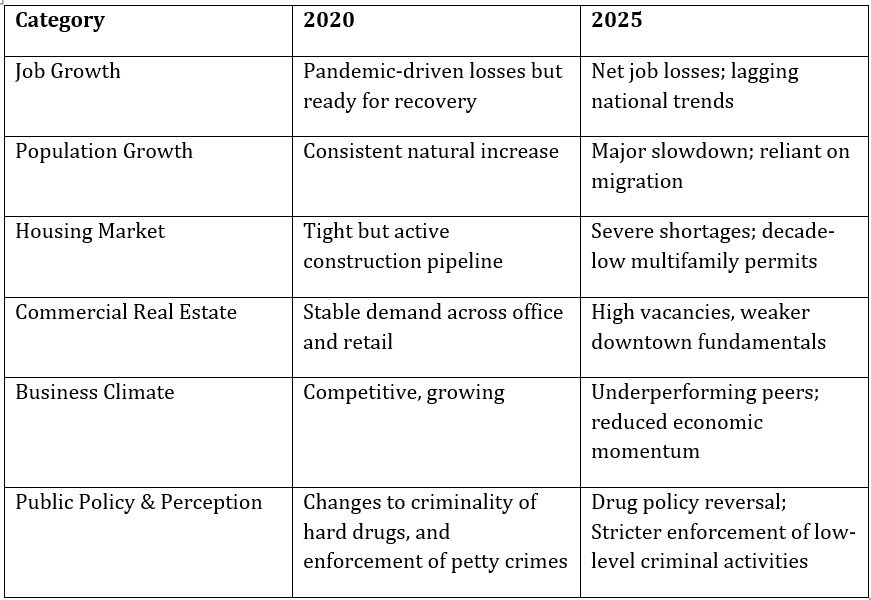 Portland entered 2020 as a growing, regionally competitive metro with strong household demand, a diversified employment base, and a population still increasing at a steady, if slowing, pace. Five years later, the story looks markedly different. The period between 2020 and 2025 reshaped the trajectory of the Portland metro economy, exposing structural weaknesses that were not fully visible before the pandemic and amplifying long‑term pressures in housing, population growth, and business competitiveness.